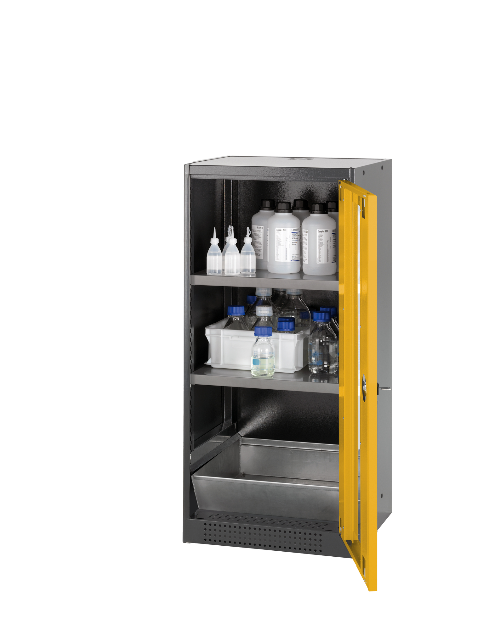 Korpusfarbe Anthrazitgrau (RAL 7016), mit Flügeltür mit Glasausschnitt in Sicherheitsgelb (RAL 1004), Inneneinrichtung mit 2 x Fachboden, 1 x Bodenauffangwanne (Stahlblech verzinkt)