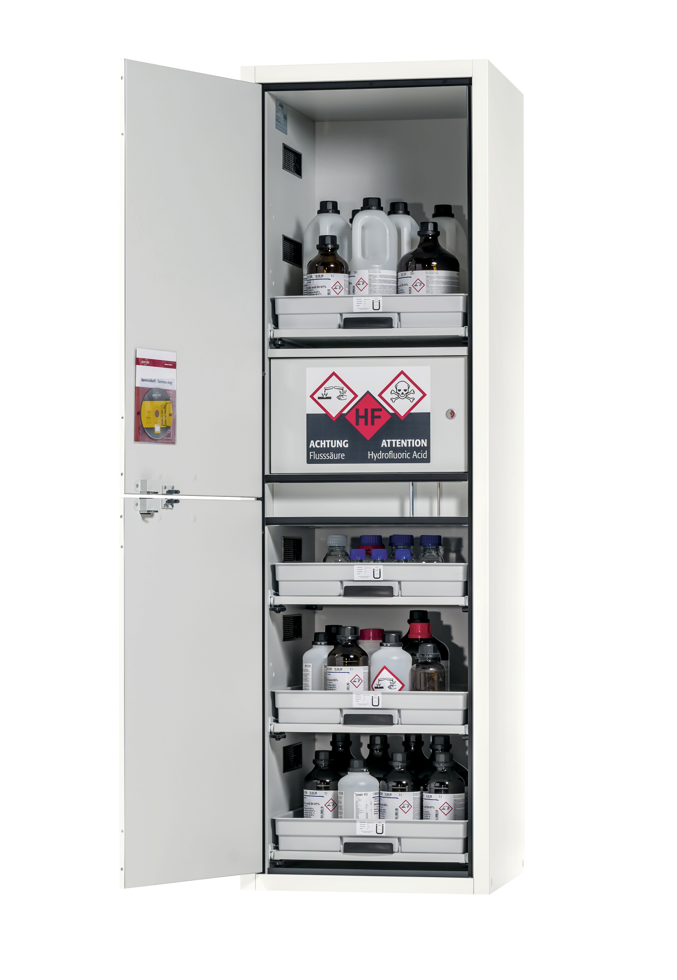 Laborweiß (ähnl. RAL 9016), Inneneinrichtung mit 4 x Tablarauszug (FP-Platte/PP melaminharzbeschichtet), 1 x Einbaufach Flusssäure (FP-Platte/PE melaminharzbeschichtet)