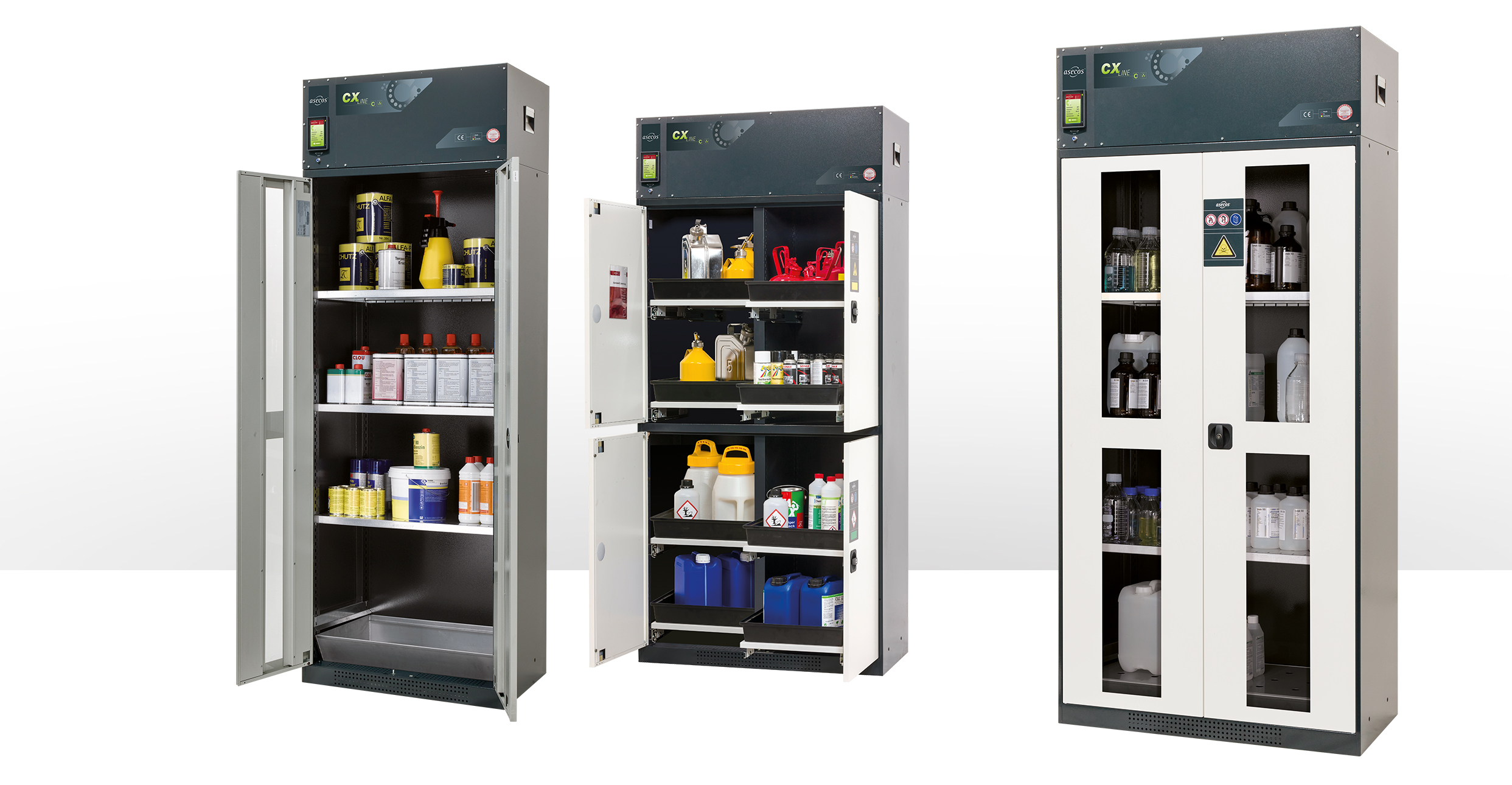 Umluftfilterschrank CX-CLASSIC-MultiRisk Modell CX.229.105.MM.4WDKorpusfarbe Anthrazitgrau (RAL 7016), mit Flügeltüren in Reinweiß (RAL 9010), Inneneinrichtung mit 8 x Tablarauszug (Stahlblech/Polypropylen pulverbeschichtet)ZertifizierungDIN EN 16121/16122 konformCE konformFunktion / KonstruktionRobust und langlebig - Robuste, geschweißte Konstruktion für höchste industrielle Beanspruchung, hochwertige, kratzfeste Strukturlackierung, doppelwandige TürkonstruktionAlles in einem: verschiedene Abteile (mehrfache Teilung) erlauben die Lagerung unterschiedlicher Gefahrstoffe in einem SchrankKeine unbefugte Benutzung: Türen abschließbar mit einem im Drehgriff integrierten Zylinderschloss, jedes Lagerabteil kann separat geöffnet und abgeschlossen werdenEinfache Aufstellung: integrierte Stellfüße zum Ausgleich von BodenunebenheitenUmluftfiltermodulIdeal zur Aufstellung in Arbeitsräumen- flüsterleise mit nur ca. 39 dB(A)Mit mehrstufigem BreitbandfilterElektronik zur Abluftüberwachung inklusive Anschlusskabel und NetzsteckerOptischer und akustischer Alarm inklusive potentialfreiem AlarmkontaktDisplay mit innovativem TouchpanelManuelle Filtersättigungskontrolle mit Probeentnahmeventil