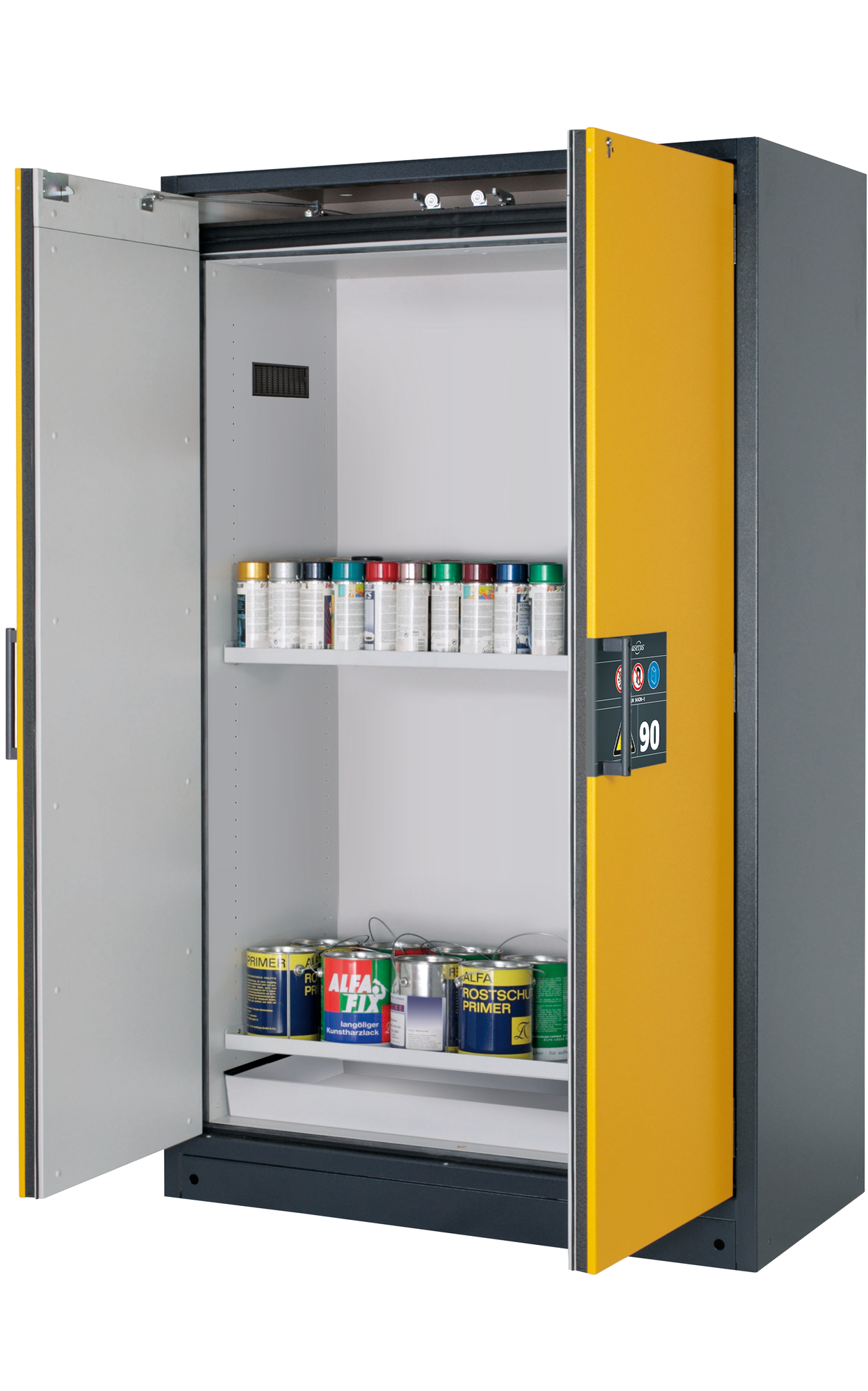 Korpusfarbe Anthrazitgrau (RAL 7016), mit Flügeltüren in Sicherheitsgelb (RAL 1004), Inneneinrichtung mit 2 x Fachboden, 1 x Bodenauffangwanne (Stahlblech pulverbeschichtet)