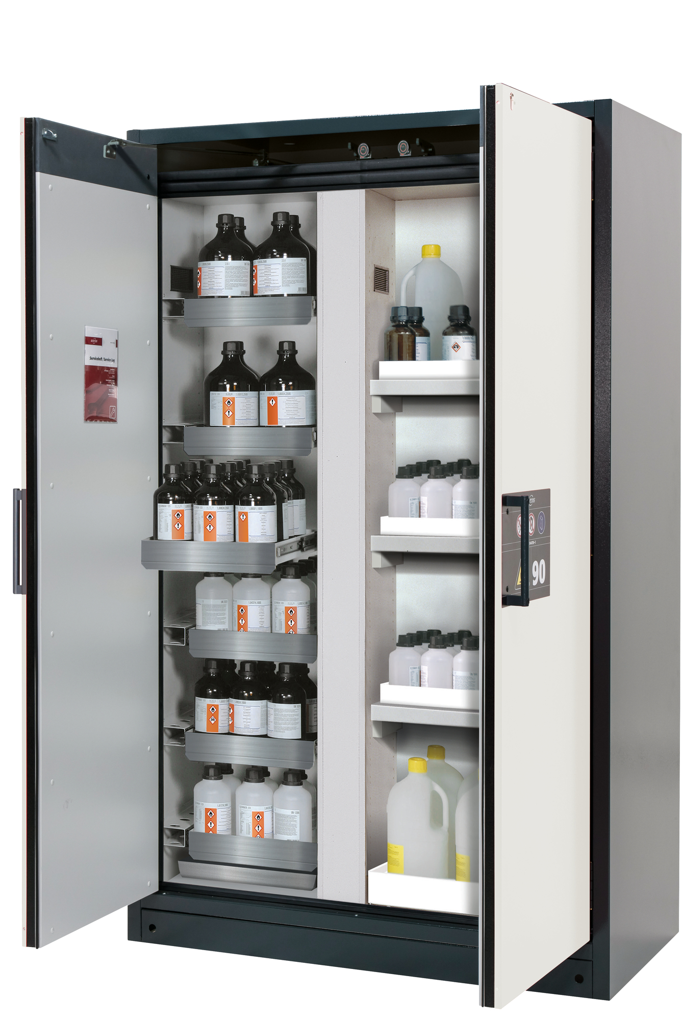 - Zwei in einem: zwei Abteile (vertikale Teilung) erlauben die Lagerung entzündbarer und aggressiver Gefahrstoffe in einem Schrank