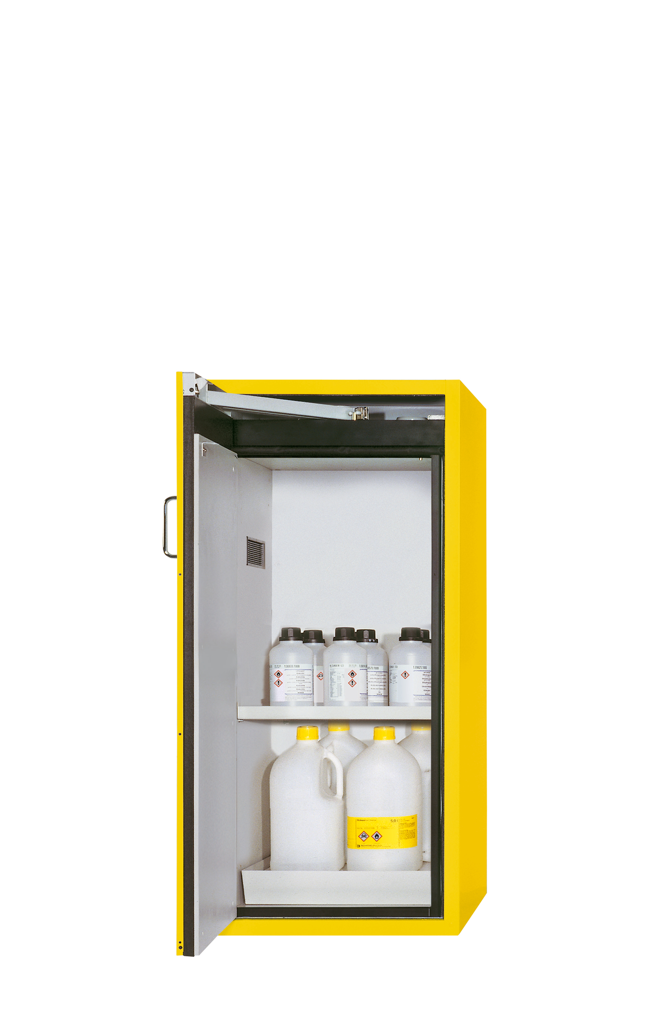 Sicherheitsgelb (RAL 1004), Inneneinrichtung mit 1 x Fachboden, 1 x Lochblecheinsatz, 1 x Bodenauffangwanne (Stahlblech pulverbeschichtet)