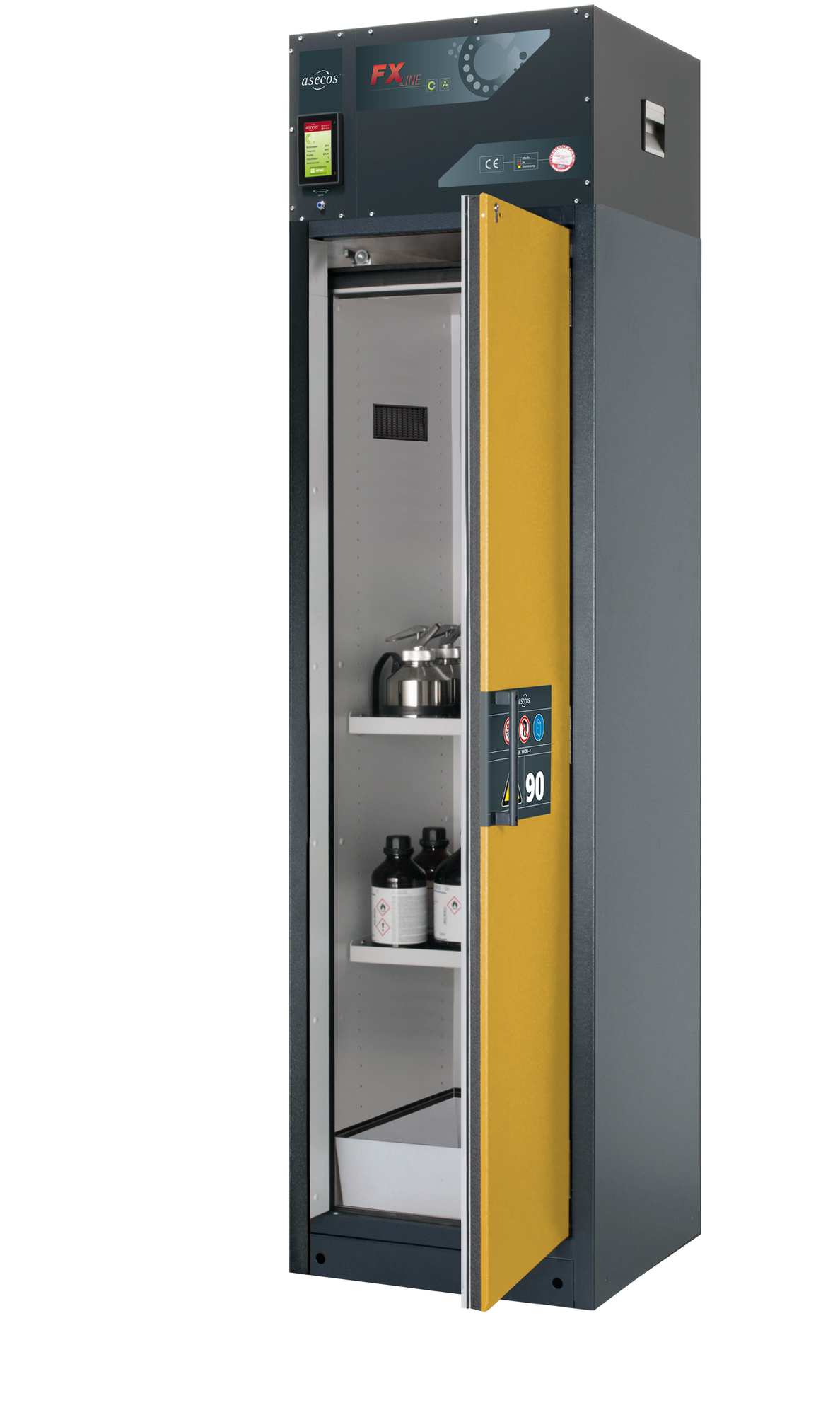 Korpusfarbe Anthrazitgrau (RAL 7016), mit Flügeltür in Sicherheitsgelb (RAL 1004), Inneneinrichtung mit 2 x Fachboden, 1 x Bodenauffangwanne (Stahlblech pulverbeschichtet)