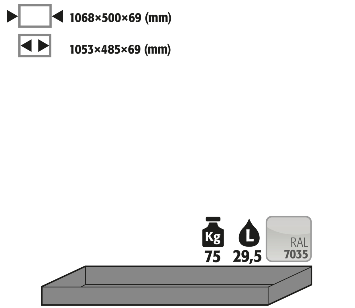 Produktinformationen "Wannenboden Standard für Sicherheitsschränke S30, pulverbeschichtetes Stahlblech Lichtgrau RAL 7035, Maße 1068x500x69 mm"