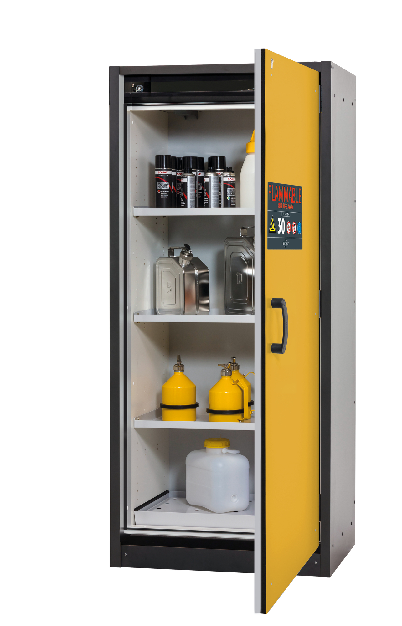 Korpusfarbe Anthrazitgrau, mit Flügeltür in Sicherheitsgelb (RAL 1004), Inneneinrichtung mit 3 x Fachboden, 1 x Lochblecheinsatz, 1 x Bodenauffangwanne (Stahlblech pulverbeschichtet)