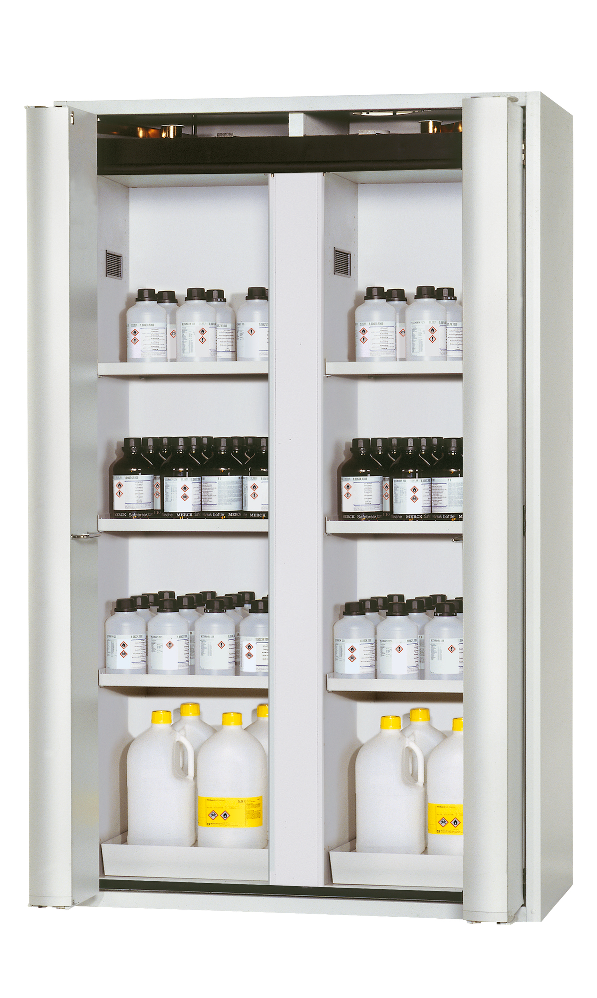 - Zwei in einem: zwei Abteile (vertikale Teilung) erlauben die Lagerung entzündbarer und aggressiver Gefahrstoffe in einem Schrank