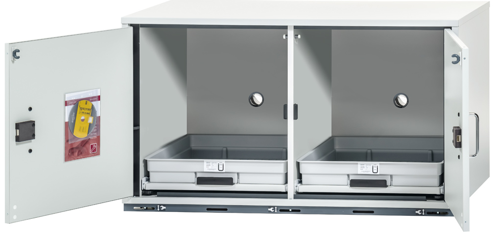 Lichtgrau (RAL 7035), Inneneinrichtung mit 2 x Tablarauszug (FP-Platte/PP melaminharzbeschichtet)